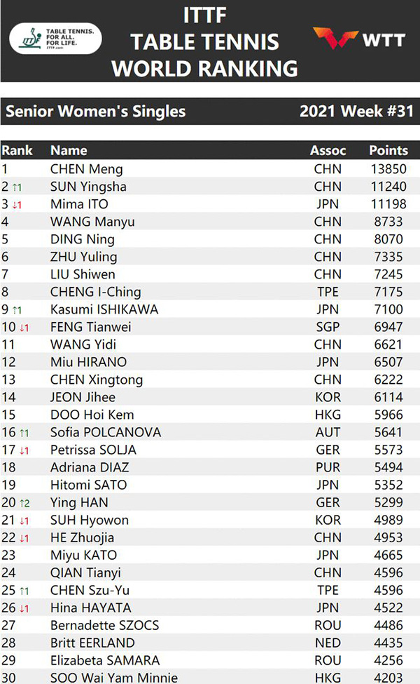 此前一直排名世界第一的陈梦,凭借奥运会冠军积分进一步巩固了自己的领跑优势。中国新生代主力孙颖莎则也向前跃进一步,将日本选手伊藤挤出前两名。不过尽管伊藤美诚名次下滑一位,但仍然领先第四名的王曼昱2000馀分,短期内不会跌出前三。