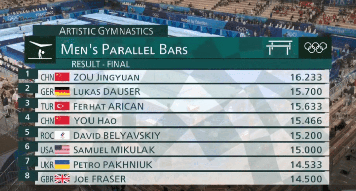 邹敬园和尤浩进入决赛,决赛的对决,邹敬园在第二个出场,他的难度是6.9分,完成非常出色,完成分达到了9.333分,拿到了16.233分,排名第一位。尤浩的成绩是15.466分,在最后一名德国选手出场前,他排名第三位。预赛排名第二的德国选手完成也是不错,拿到了亚军,尤浩遗憾无缘奖牌,邹敬园以较大优势拿到金牌。