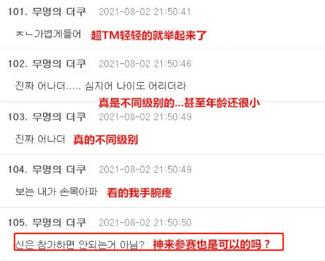有韩国网友表示,“很轻松就举起来了”,“真的是不同级别的,甚至年龄还很小”,“真的是不同级别”,“神来参赛也是可以的吗”。