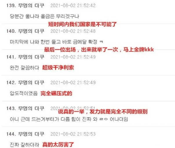 而韩国网友也同时认为,在短时间内,韩国队不会出现像李雯雯有这么出色的选手。“短时间内我们是不可能了”,“最后一位出场,出来就举了一次,马上金牌”,“超级干净利索”,“完全碾压”。