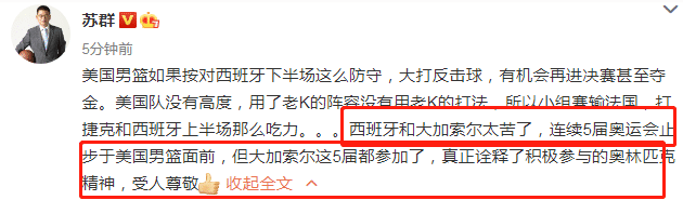 而苏群老师则认为大加索尔实在太苦了,在西班牙男篮坚守近20年时间,但却无缘奥运金牌,既生瑜,何生亮。
