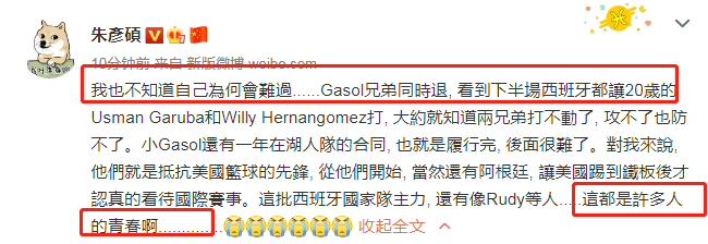 加索尔兄弟退出国家队,西班牙男篮一个时代结束了,让人非常感慨。名嘴朱彦硕表示,他很难过。“不知道自己为何会难过,加索尔兄弟同时退出,两兄弟打不动了,攻不了,防不住”。