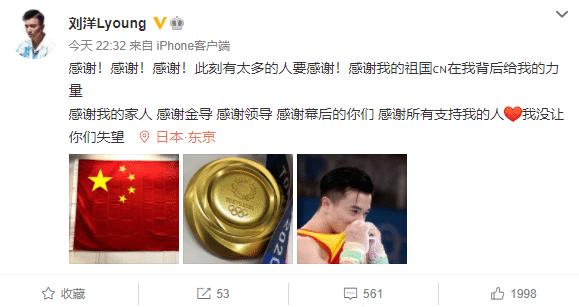 在夺得吊环金牌后,刘洋在社交媒体发声:感谢!感谢!感谢!此刻有太多的人要感谢!感谢我的祖国