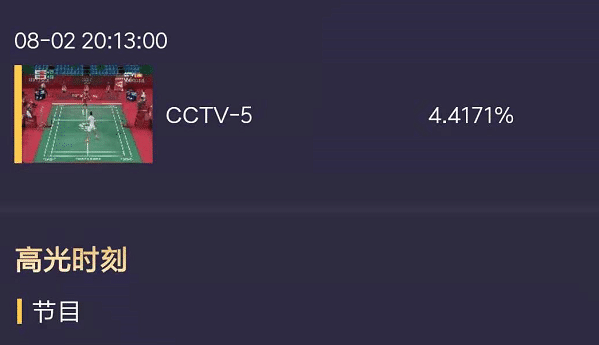 这场比赛外界的期待值也是很高的,因为谌龙在不被看好的情况下杀入到了奥运会的决赛,所以很多人也都希望卫冕冠军谌龙可以延续好状态完成逆袭。这点从收视率就可以看出来,这场“双龙会”的收视率在巅峰时突破了4.4,高达4.4171,这是一个相当高的数据了,要知道东京奥运会的开幕式整体收视率在国内还不到5,由此就可以看出外界对于谌龙冲金有多么期待。