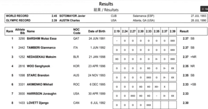 男子跳高决赛,有3名运动员都跳到了2.37米,三人均在2.39米试跳三次失败,这样三人的成绩相同。按照规则,比较失败次数,三人都一样。其次比较整场比赛的失败次数,其中坦贝里和巴尔希姆比白俄罗斯选手少失败2次。