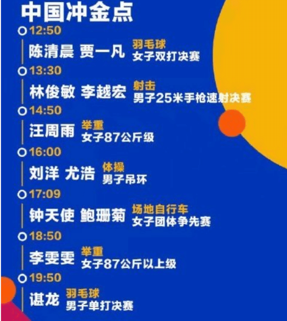 射击赛场上,林俊敏、李越宏参加男子25米手枪速射,林俊敏曾是这个项目的世界冠军,期待在决赛有稳定的发挥,射击的变数很大,关键还是考验心态。体操赛场,16点开始的吊环决赛,刘洋和尤浩进入决赛,两人也要全力冲击本届奥运会体操的首枚金牌。此外,在自行车的赛场上,钟天使/鲍珊菊的女子自行车团体竞速赛也有争夺金牌的希望。
