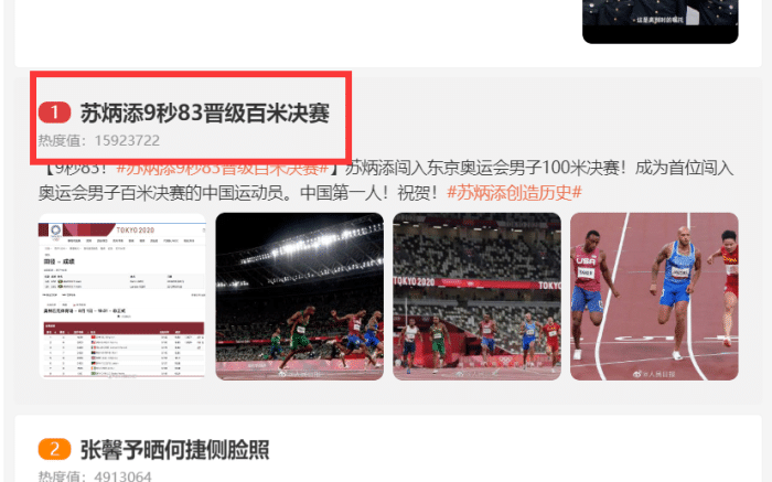 苏炳添8秒83的成绩,也迅速登顶热搜。网友们纷纷评论:“太令人难以置信了”,“苏炳添 中国飞人 亚洲飞人”,“第一个站上奥运100米飞人决赛的黄种人”。