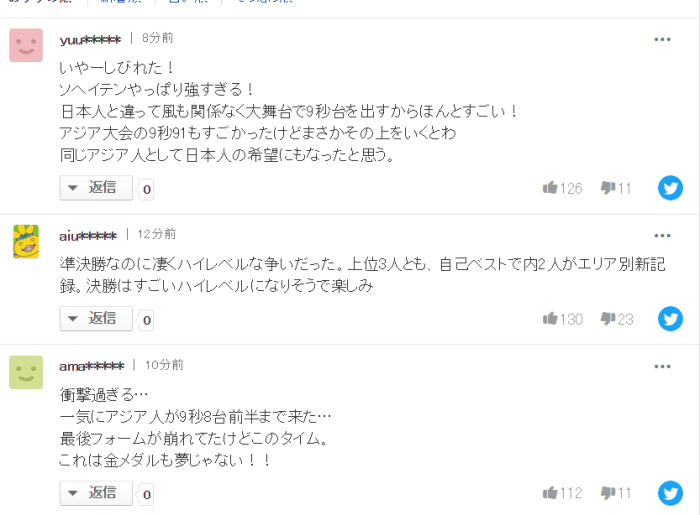 除了中国网友,连日本和韩国网友也纷纷盛赞苏炳添的表现。日本网友在新闻评论中写道:我麻木了,苏炳添太强了,和日本人不一样,他太神奇了,在这样的大舞台跑出了这样的成绩,亚运会9秒91已经很惊人,他会激烈日本人和亚洲人。此外,韩国媒体也第一时间报道了苏炳添的成绩,直言他打破了亚洲的历史。