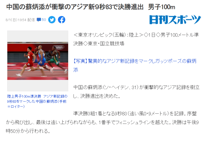 来源:直播车08-02 10:30直播车讯 北京时间8月1日,苏炳添在奥运男子百米飞人大战中,跑出了疯狂的9秒83!这一成绩,足以让苏炳添成为中国体育历史上最传奇的人物之一,足以比肩姚明、李娜、刘翔等中国体育金字塔最顶尖的传奇。赛后,苏炳添的这一成绩不但引爆中国社交媒体,就连近邻日韩网友也疯狂称赞!