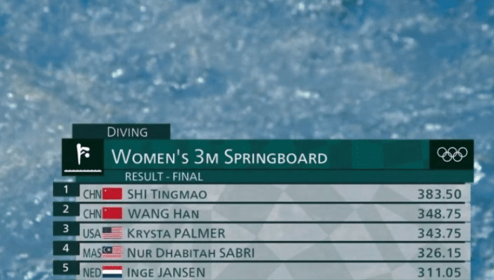 施廷懋在本届奥运会的夺冠分数是383.50分,那么说谁才是三米板个人夺冠的最高分数呢?在三米板改制之后的这么多年,保持最高分的正是今天和施廷懋合影的郭晶晶,作为跳水女皇,郭晶晶在2008年北京奥运会女子单人3米板的决赛跳出415.35分,这一数据和施廷懋本届奥运会夺冠的分数对比,还是有明显的优势。