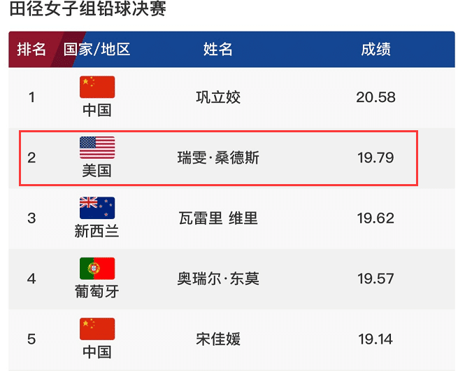 同时巩立姣还直接浇灭了对手反扑的气势,倒数第二投,美国的桑德斯第五投19米79,个人最好成绩,最后一投超过20米但犯规。看到对手起势,巩立姣直接以连续破个人最佳成绩的20米53和20米58,强势拿下金牌。