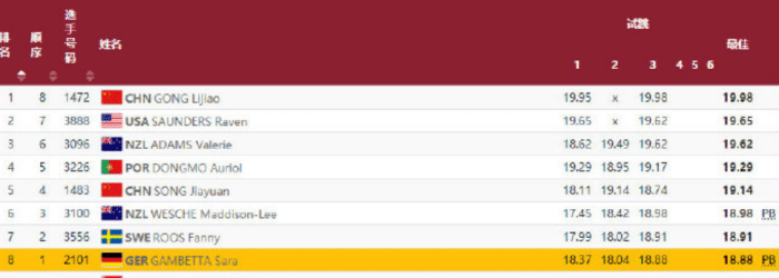 决赛开始后,巩立姣的第一投就是高水准,19米95,排名第一位,本赛季巩立姣多次突破20米,而且她的成绩排名世界第一。宋佳媛之后出场,她的第一投成绩是18米11,先找找感觉。高阳第一投是18米45,也是先冲击前8位。按照规则,前8名才有后3投的机会。