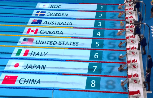 在此前结束不久的女子50米自由泳决赛中,我国选手吴卿风拿到了。紧接着进行的是女子4x100米混合泳接力比赛,我国由张雨霏,杨浚瑄,唐钱婷和彭旭玮四名队员出战。比赛开始,中国队在第八道出发,第一棒仰泳,中国队处于落后位置,以第六名的位置交到第二棒,蛙泳中国队追上了一些距离,在第二集团中处在领先位置中。