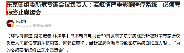 然而,东京奥运会是否还能继续举办,可能出现变数,对于各个代表团来说,这都是不利的消息。在奥运会赛程已经过半的情况下,东京疫情爆发。据国内权威媒体《环球网》报道,日本东京疫情非常严重,而东京奥组委新冠对策专家会议负责人冈部信彦,他认为形势比较严峻,如果医疗系统面临压力,应该考虑终止奥运会。