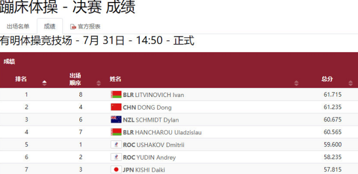 白俄罗斯选手登场之后,他的动作难度确实很高,但也有明显的“位移”,只是通过自己的调整才扳了回来。但就是这样的失误的情况下,白俄罗斯选手最后时刻的61.715分,依旧比中国队选手董栋的61.235分要高。得知自己夺冠之后,白俄罗斯选手自己都不敢相信,当场洒泪。
