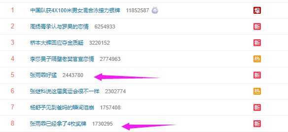 赛后中国队获得4x100米男女混合泳接力银牌冲上热搜第一名,而“张雨霏好猛”和“张雨霏已经拿了4枚奖牌”这两个关键词也冲上热搜榜——在东京奥运会,23岁的张雨霏已经拿到女子100米蝶泳银牌、女子200米蝶泳金牌、女子4x200米自由泳接力金牌和男女4x100米混合接力银牌。