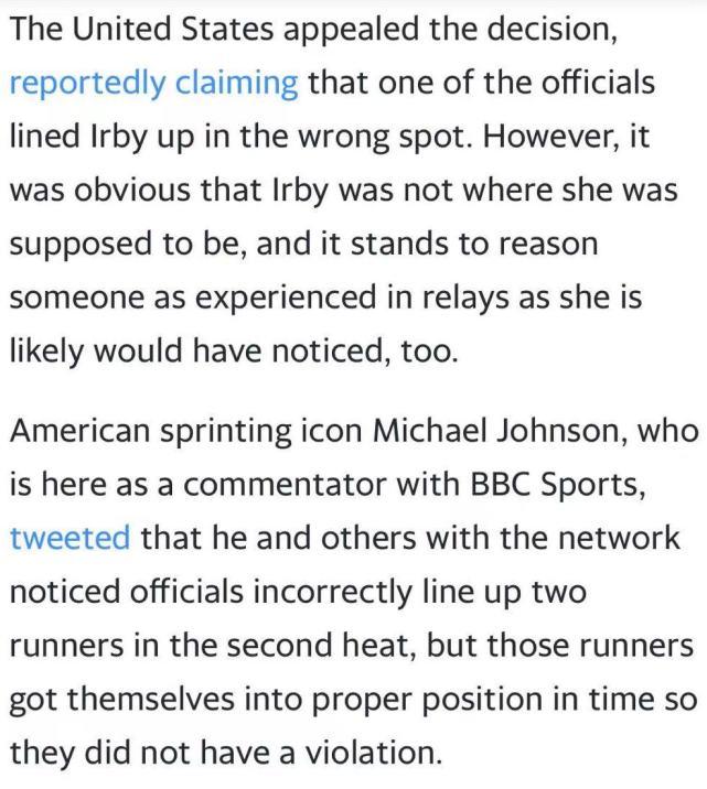 而来自雅虎体育的最新消息,美国方面无法接受接力资格被取消的判罚,因为这本来是美国稳拿的一块金牌。美国队将就被取消决赛资格的判罚提起上诉,美国代表团方面认为,美国队的接力选手伊尔比,之所以站在错误的位置,是因为一位官员要求她站在这一位置的。像伊尔比这样有经验的运动员,是不太可能犯下这样的低级错误的。