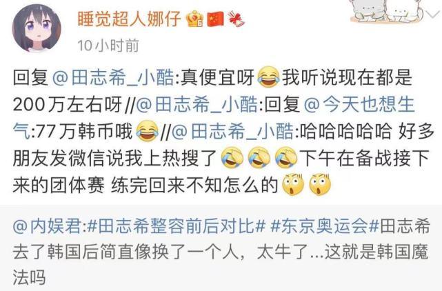 令人意外的是,田志希本人竟然没有对于自己疑似整容的议论有所避讳,她还主动在社交账号上与中国网友热情互动。田志希甚至大方承认自己整容过程,并称自己的双眼皮花了77万韩元(约合4300元人民币)。
