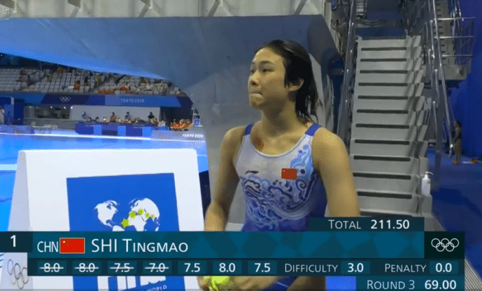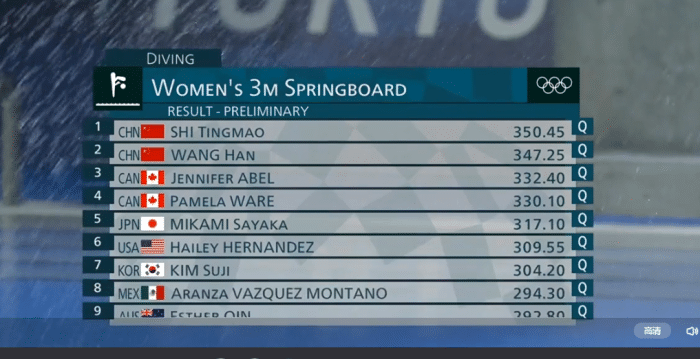 第五跳中国两位选手依旧是发挥完美,最终成绩中国队的施廷懋第一名晋级,王涵第二名晋级,中国队将向这个项目的奥运五连冠发起冲击。