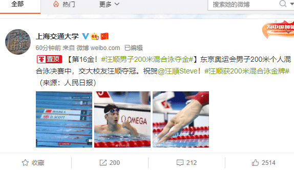 汪顺夺冠之后引发外界极大的关注度,他的母校上海交通大学就送上祝福,上交大表示:“【第16金!汪顺男子200米混合泳夺金】东京奥运会男子200米个人混合泳决赛中,交大校友汪顺夺冠。祝贺汪顺获200米混合泳金牌。