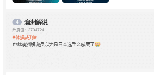 而这边,连英国和澳大利亚的解说也对本场比赛裁判的判罚提出了质疑。英国BBC认为裁判最后给肖若腾的分数太低了。澳洲结束对日本选手出界还能拿高分感到不可思议,直呼裁判员是日本选手的亲戚吧!