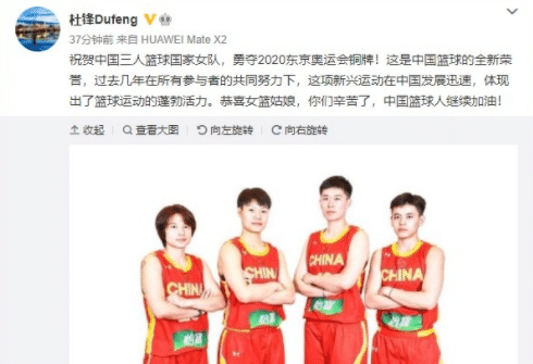 除了姚明之外,中国男篮主帅杜锋在社交媒体上送上祝福,他表示:“祝贺中国三人篮球国家女队,勇夺2020东京奥运会铜牌!这是中国篮球的全新荣誉,过去几年在所有参与者的共同努力下,这项新兴运动在中国发展迅速,体现出了篮球运动的蓬勃活力。恭喜女篮姑娘,你们辛苦了,中国篮球人继续加油!”