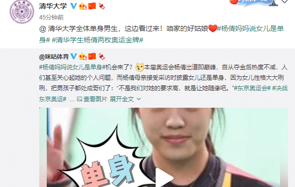 很快杨倩的母校清华大学知道了,他们在官方社交媒体上发文给杨倩介绍对象,而且还是推荐给了全部的清华男同学:“清华大学全体单身男生,这边看过来!咱家的好姑娘”。