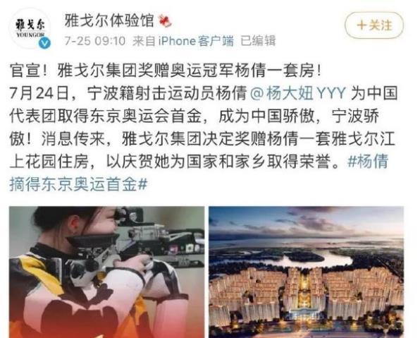 在杨倩夺冠之后,杨倩家乡的某房地产开发商也是迅速宣布,将奖励给杨倩一套豪宅。杨倩的豪宅有多大呢?根据媒体的报道,因为该房地产开发商宣布奖励豪宅被质疑蹭热度之后,该开发商也是表示,自己奖励的楼盘已经售空,不存在蹭流量打广告的事情。也是因为房屋已经卖完,所以房地产开发商这次奖励给杨倩的房子是样板房。