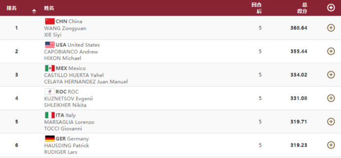 谢思埸是2019年世锦赛的男子三米板单双人冠军,王宗源在2019年世锦赛上拿到一米板的冠军。这次两人一起出战奥运会,在之前的队内选拔赛上,他们的成绩稳定,还创造最好成绩。奥运会决赛的对决,谢思埸和王宗源是第7个出场,总共有8对组合出战,上一届里约奥运会,中国队的曹缘和秦凯只拿到铜牌,这一场王宗源和谢思埸承担重任。