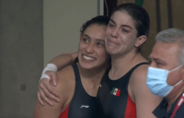 同样哭泣的还有墨西哥组合。墨西哥组合最终的成绩是299.70分,而第四的加拿大组合则是299.16分,只领先了0.54分!墨西哥一位姑娘也瞬间泪崩。奥运铜牌对于她们和整个墨西哥,都非常重要,这也是一个荣耀时刻。