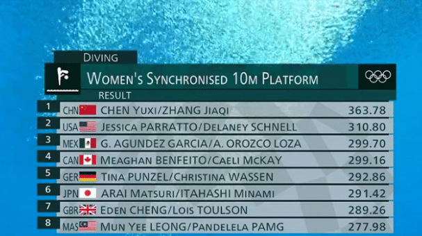 同样因为“炸鱼”付出代价的还有加拿大队,她们的第4跳出现了失误,入水的水花非常大,纵使最后的这一跳加拿大队有不俗的发挥,但依旧以0.64分之差无缘领奖台,获得第四名,这也让她们很遗憾。