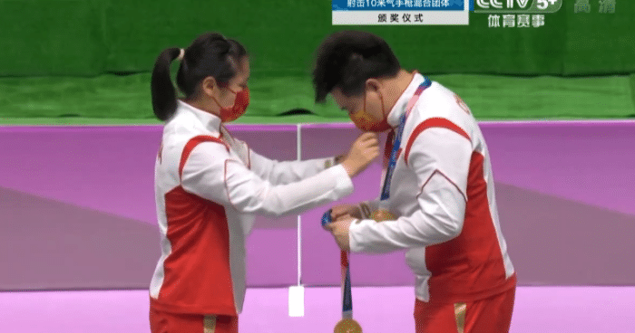 来源:直播车07-27 15:22直播车讯北京时间7月27日,中国军团再添一枚金牌,在混合团体10米气手枪决赛中,姜冉鑫/庞伟在0-4落后的情况下实现大逆转,关键时刻姜冉鑫连续打出10.7环的好成绩,最终中国队16-14击败对手夺得该项目金牌;在颁奖仪式上,21岁姜冉鑫和35岁庞伟互戴金牌太暖心。