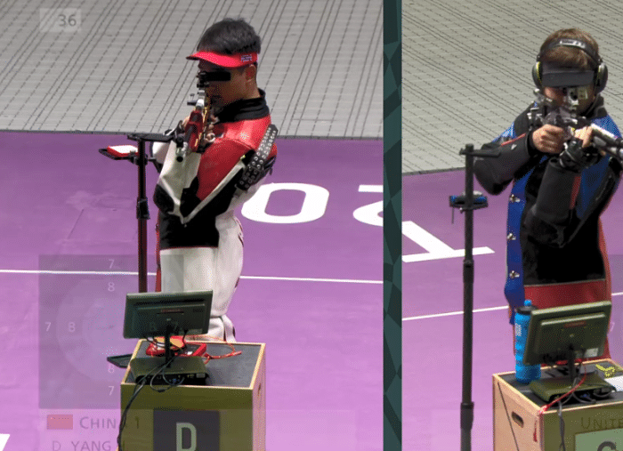 决赛还是抢16的规则,也就是两对组合谁先拿到16分。第一局,中国组合险胜拿到2分,第二局,美国组合更胜一筹。第三局,中国组合打出20.9环的好成绩,拿到2分,4比2领先。紧接着第四局的比赛,两对组合打成了平局,按照规则,各自拿到1分,中国还是5比3领先。