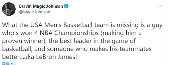 湖人名宿魔术师约翰逊发推:美国男篮缺的是赢过4届NBA总冠军的那个家伙(这让他成为一名认证过的赢家),缺的是比赛中最好的领袖以及能让队友变得更好的那个人,他就是勒布朗-詹姆斯。