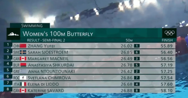 在预赛中张雨霏取得55秒82,与澳大利亚选手麦基翁并列第一。到了半决赛张雨霏再度游进56秒,成绩是55秒89,依旧是所有晋级到决赛的选手中成绩最好的,可见张雨霏的状态是非常好的。