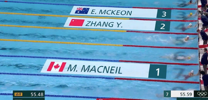 最后拿下金牌的是第七道的加拿大人麦克尼尔,成绩是55.59,她也是世锦赛的冠军。张雨霏的比赛成绩是55.64获得银牌。