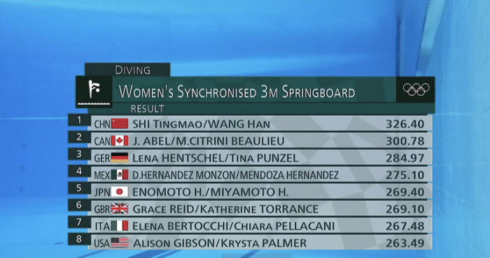 没想到的是第三轮也就是能够做自选动作的时候,美国队难度虽然高,但出现了巨大的失误,她们的一名选手身体都没有完全打开,两人入水都有很大的水花。等到了第三轮结束的时候,美国队从第一,直接跌落到了第六名,差距巨大。之后美国队的选手难度虽然高,但完成度非常差, 从第二轮的第一名,最终的成功是所有选手倒数第一,只获得了第八名。