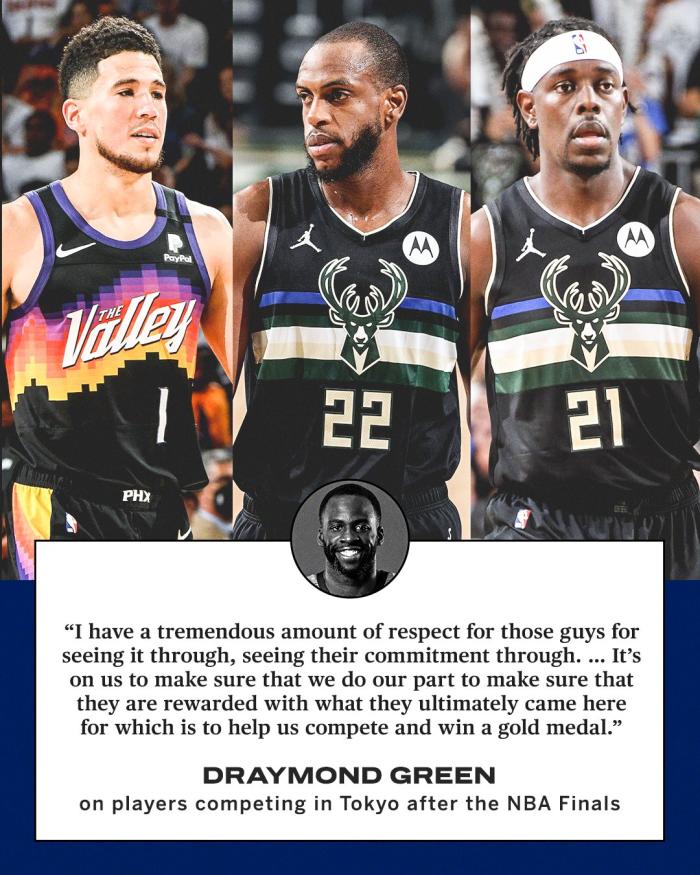 虽然打了总决赛,但米德尔顿、霍勒迪和布克都信守承诺,马不停蹄地飞往东京,对此勇士球星追梦格林表示:我非常非常尊重这些人,其实说退出是一件很容易的事,但是这些家伙信守了自己的承诺;我们必须尽自己的一份力,确保他们最终能得到一些回报,那就是一起竞争并赢得金牌。