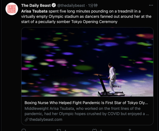 来源:直播车07-24 11:13直播车讯 北京时间7月23日,东京奥运会大幕拉开。备受瞩目的开幕式上,一名日本女拳击手登台表演成为焦点,她在现场有超过5分钟的表演时间。这位叫做亚理佐津瑞的女拳击手,同时也是一名护士。她因为疫情错过了东京奥运会,无缘本土作战,通过这样的方式,也算是弥补遗憾、“圆梦奥运”。
