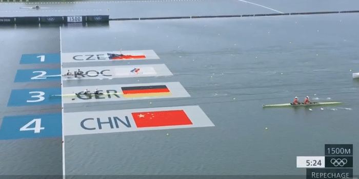 今天举行的女子双人双桨复活赛,中国队分在了第四道,比赛开始后,四支队伍的距离并没有被离开,基本是一个并驾齐驱的态势,500米的时候中国队排在了第三的位置 ,赛程过半的时候,俄罗斯奥委会排在了第一的位置 ,德国紧追其后,而中国队落后的距离也是越来越远,最终俄罗斯奥委会获得第一,德国队小组第二,捷克小组第三,中国队小组第四惨遭淘汰。