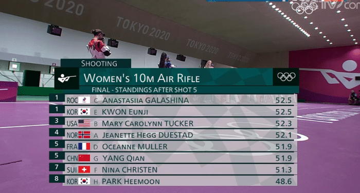 两发淘汰赛,杨倩第一枪10.5环和第二枪10.4环,总成绩125.6环并列第二,韩国选手第一个被淘汰。