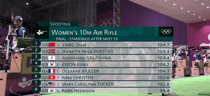 之后杨倩两枪成绩分别是10.8环和10.9环,又升到第一名;杨倩10.2环和10.8环,领先对手0.7环;杨倩继续保持好成绩,杨倩第19抢10.6环,第20枪10.5环,杨倩杀入奖牌争夺战;10.7环和
