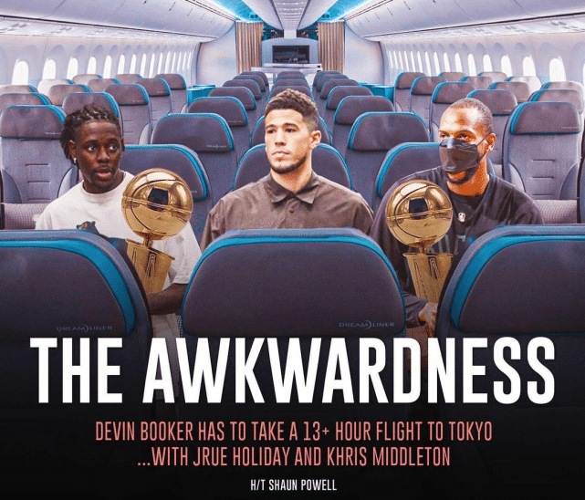 霍乐迪和米德尔顿将参加雄鹿的夺冠游行,随后,美国男篮将派私人飞机接他们两人和布克一起前往东京。美媒也调侃这会是一次奇怪的旅行,因为布克要和两个对手一起度过13个小时的飞行时光。刚刚输给他们俩,却很快要成为队友,布克的心情肯定不怎样。