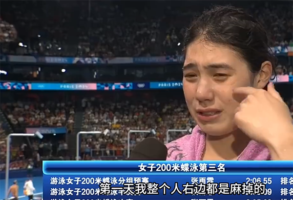 赛后在接受采访时,张雨霏流着泪表示:“昨天刚发烧完,今天好了以后,又碰上生理期第一天,我整个人右边都是麻掉的。我都没想到能游那么快,因为下水前一直在麻,我准备活动都不像平常那样,我只游了一千米,我就起水了。”
