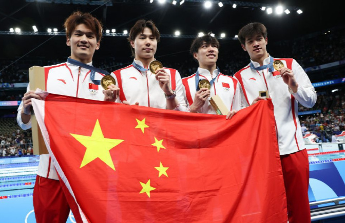 在游泳收官日的比赛中,由徐嘉余、覃海洋、孙佳俊、潘展乐组成的中国男子4x100米混合泳接力队,以3分27秒46的成绩夺得金牌,中国队也打破了美国队在该项目长期的垄断。
