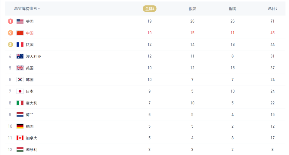 而这一天,东道主法国和澳大利亚、英国都集体沉寂,没有金牌进账,这三支代表队,分别暂时位列第3至第5位。