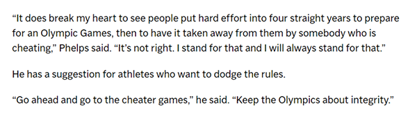 菲尔普斯也回应了皮蒂的言论:“看到人们连续四年努力备战奥运会,金牌却被作弊者夺走,我感到非常心碎,这是不对的,我将永远支持这一点。”菲尔普斯还补充道:“去参加作弊游戏吧,让奥运会保持诚信。”