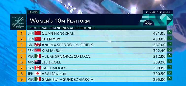 第五轮,陈芋汐完美收官,得到81.60分,五轮总分403.05分排名第二;全红婵最后一跳同样完美入水,得到86.40分,五轮总分421.05分排名第一,仅有她俩总分超过400分,展现中国跳水队的统治力。
