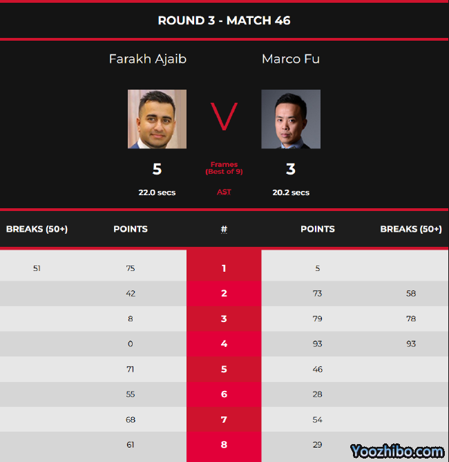 第一局法拉赫.阿贾布打出单杆51分转入防守,随后法拉赫.阿贾布再次上手,以75-5先拔头筹,第二局法拉赫.阿贾布得到42分中断进攻,傅家俊打出单杆58分,以73-42扳回一局,紧接着傅家俊打出单杆78分再赢一局。第四局傅家俊趁势追击,通过长台上手,打出单杆93分,可惜走位不到没能完成破百,取得3-1领先进入中场休息,法拉赫.阿贾布是唯一拥有职业资格的巴基斯坦选手,从前四局的表现来看,法拉赫.阿贾布的个人能力一般,打出单杆50+有些困难,他的比赛进程很不流畅。