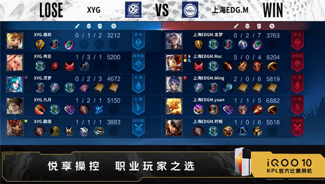 双方常规开局。2分15秒XYG拿下暴君。3分30秒XYG中路击杀周瑜拿到一血。4分07秒XYG发育路击杀马可波罗。5分21秒上海EDG.M拿下主宰。5分35秒XYG对抗路击杀马可波罗。7分14秒上海EDG.M中路击杀吕布。8分50秒野区团战XYG野区打出0换2。8分07秒XYG澜野区单杀马可波罗。9分22秒XYG对抗路打出0换2。9分34秒上海EDG.M野区击杀沈梦溪。11分24秒中路团战XYG击杀关羽。11分37秒上海EDG.M摧毁敌方中路二塔。13分18秒高地团战双方1换1。15分11秒高地团战XYG打出0换2。15分57秒XYG对抗路打出0换2。16分36秒XYG摧毁敌方对抗路、中路高地塔。16分59秒XYG拿下暗影主宰。18分09秒高地团战双方1换1。22分22秒XYG拿下风暴龙王,团战XYG打出2换5。22分59秒XYG摧毁敌方水晶拿下比赛。